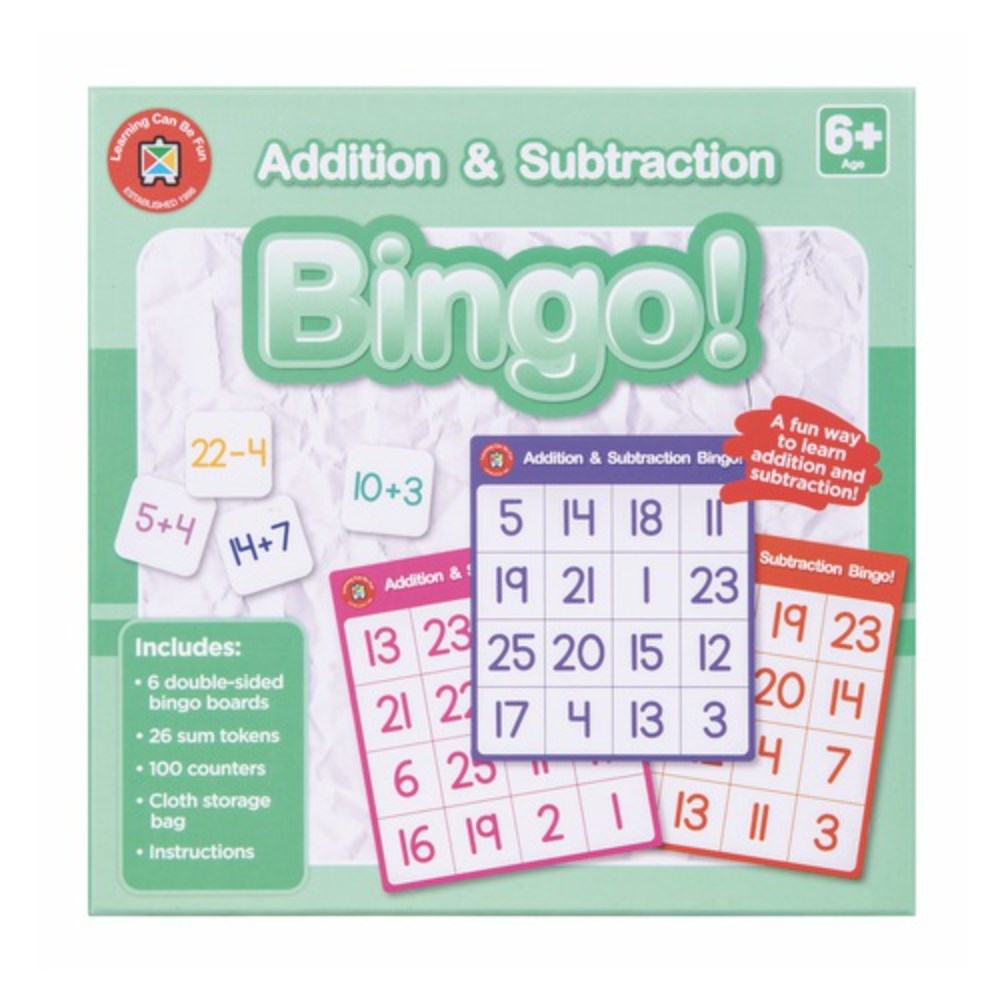 • Includes: 6 double-sided bingo boards, 26 sum tokens, 100 counters, cloth storage bag and instructions.