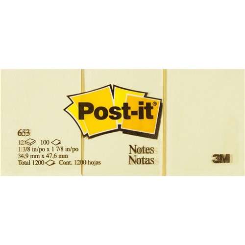 Post-It 653 Notes Original 38 x 50mm Yellow Pad 100 Sheets Pack of 12