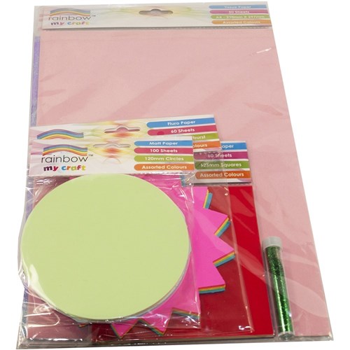 • Pack includes assorted A4 paper, shapes (starbursts, circles, squares), A4 specialty paper, 1 x A4 sketch book, 1 x glitter vial and a craft project sheet.