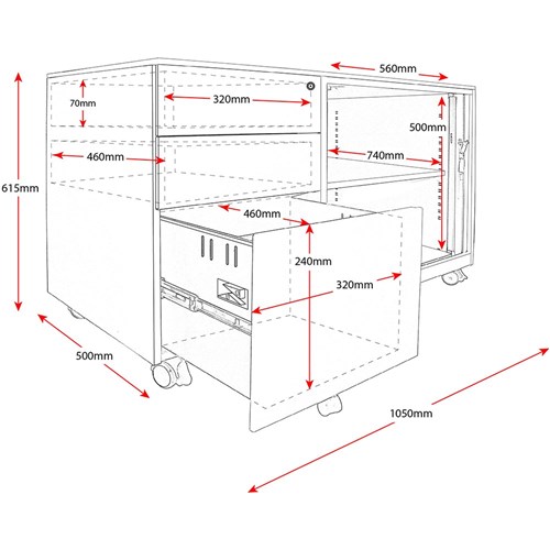 • Internals: Tambour Size 560W x 740D x 500H, Top two drawers 320W x 460D x 70H, Bottom filing drawer 320W x 460D x 240H.