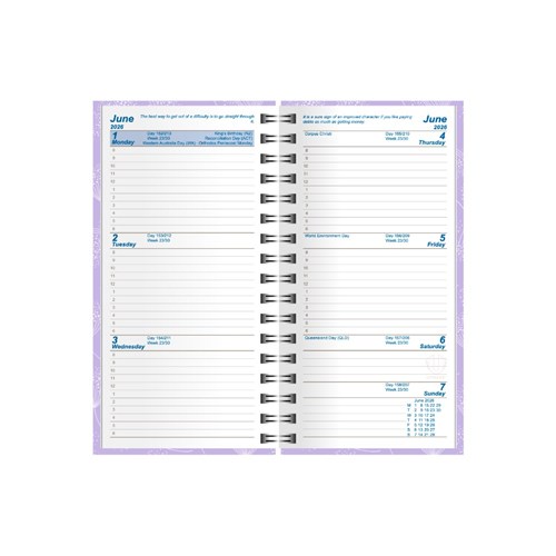 • With a pocket size that makes it easy to carry around with you, this diary features a week to view layout and double wire binding so you can easily open and close it while on the go.